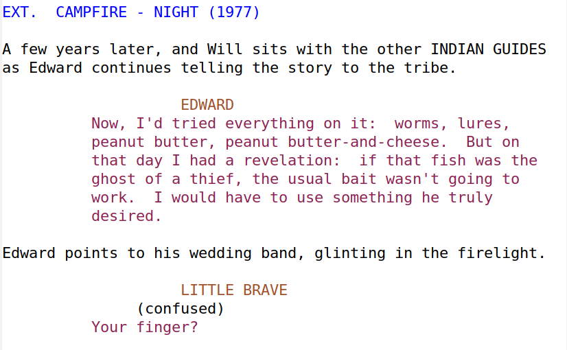Fountain mode is basically like org mode for screenplays. I’ll repeat that. Fountain mode is like org mode for screenplays. Just stop and think about that.